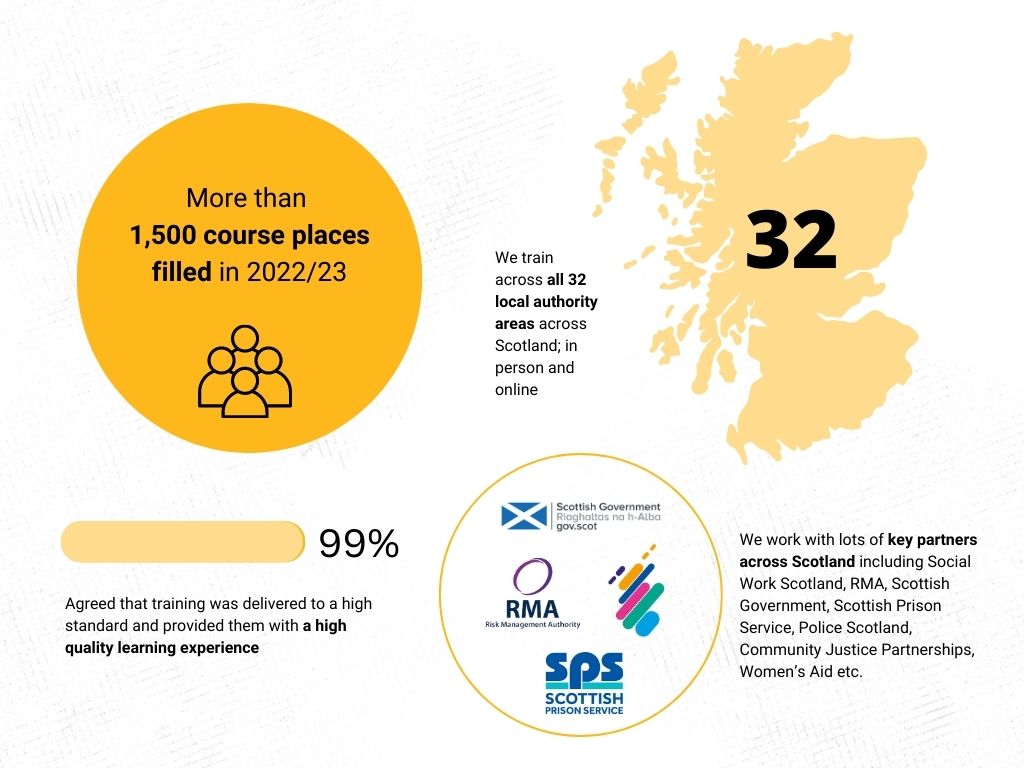 More than 1,500 course places were filled in 2022-23 covering all 32 local authority areas across Scotland. Attendees have included justice social workers, people involved in the delivery of unpaid work and restorative justice practitioners. We ran 241 days of live training sessions in person or on Teams and 191 days of training via self-paced working.