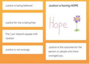 Does this not make you think about the term ‘justice’ and what that actually means to people who experience harm? Also, how organisations could strive to work together to develop safe and robust mechanisms for individuals to choose how to address harm and its lasting impact by designing a justice process they define and not continuing with what the system prescribes? This doesn’t take away the need for a justice system – it’s about looking at improving it through more trauma-informed, person-centred action.