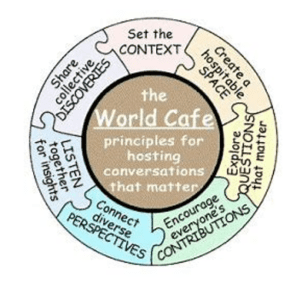 ‘World café is a restorative approach used to facilitate group conversations where everyone is valued, included, respected and given a voice. Moving away from traditional focus groups, this method creates a safe environment that mimics a café. I look forward to hosting these in the new year and welcome anyone to get in touch who wants to have a conversation.