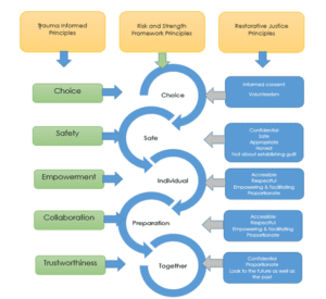 By fusing together trauma informed and restorative justice principles I’ve come up with ways to support the development of a risk and strengths framework. This will hopefully strengthen our ability to provide safe and appropriate services that people can access, that reduce re-victimisation and support recovery.