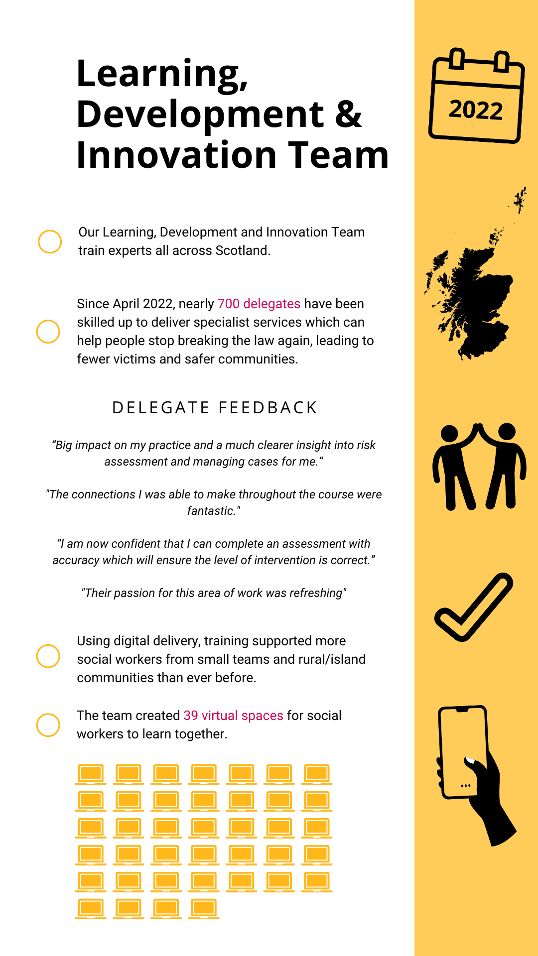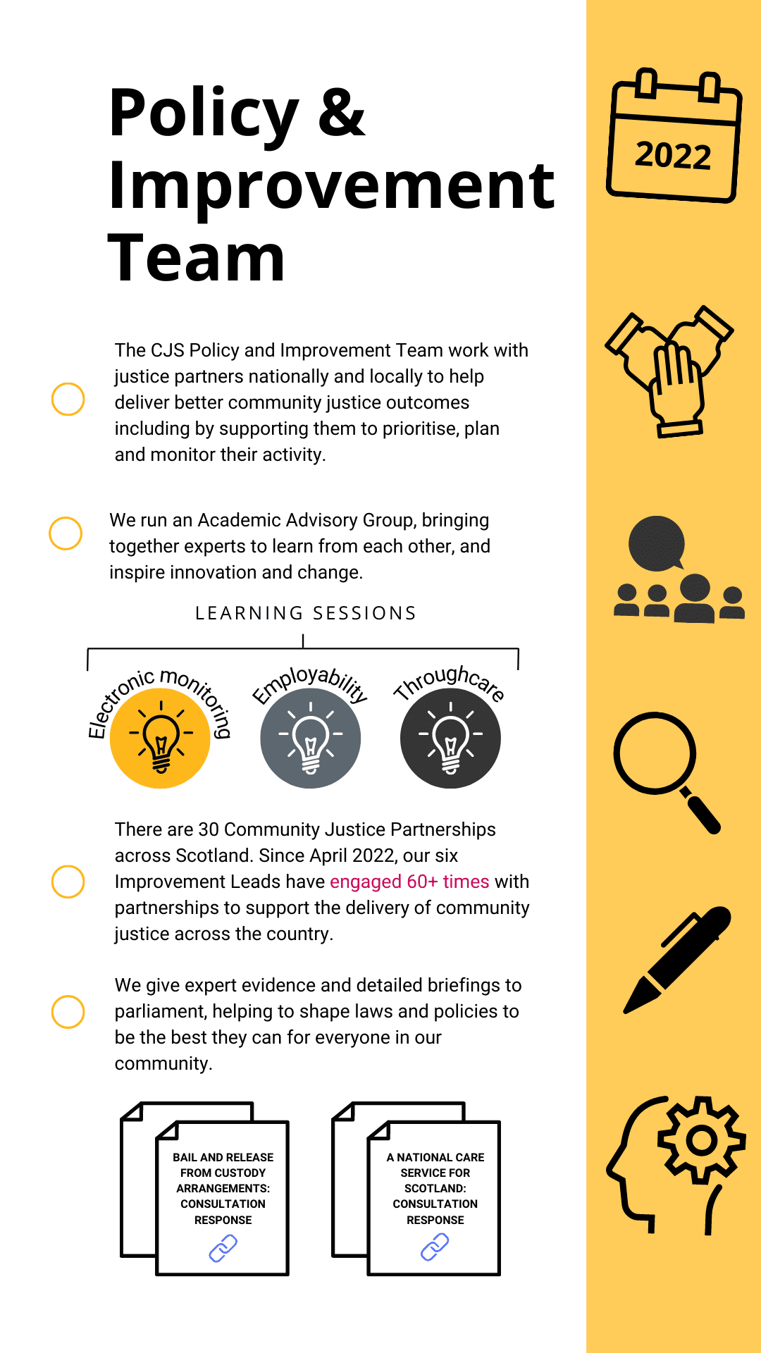 Every team at Community Justice Scotland (CJS) plays a vital role in helping to deliver organisational aims; including the delivery of the Scottish Government’s National Strategy for Community Justice.